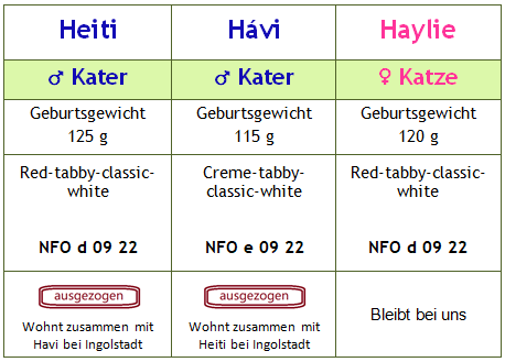 Haylie: NFO d 09 22 - red-tabby-classic+white Mohrle: NFO n 09 - Schwarz-Weiss