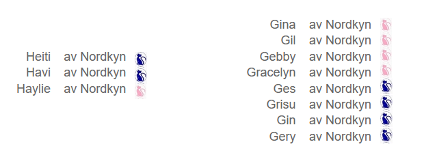 | Arik Antero Armas Are-Witas Anniki Alasdair | av Nordkyn av Nordkyn av Nordkyn av Nordkyn av Nordkyn av Nordkyn | Bjarki Brynja Brimi Barri Bjell Beyla Balthazar | av Nordkyn av Nordkyn av Nordkyn av Nordkyn av Nordkyn av Nordkyn av Nordkyn |